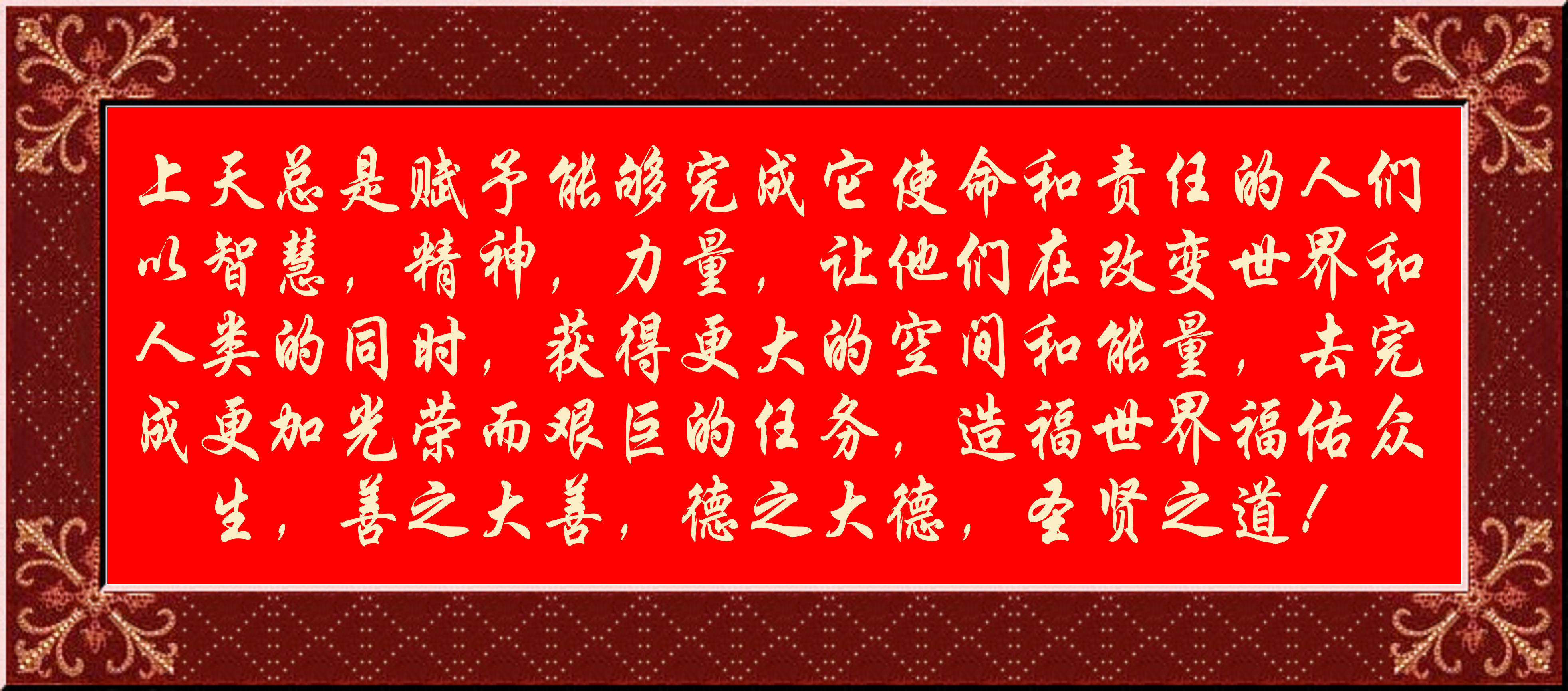 上天總是賦予能夠完成它使命和責任的人們以智慧,精神,力量,讓他們在改變世界和人類的同時,獲得更大的空間和能量,去完成更加光榮而艱巨的任務,造福世界福佑眾生,善之大善,德之大德,圣賢之道!