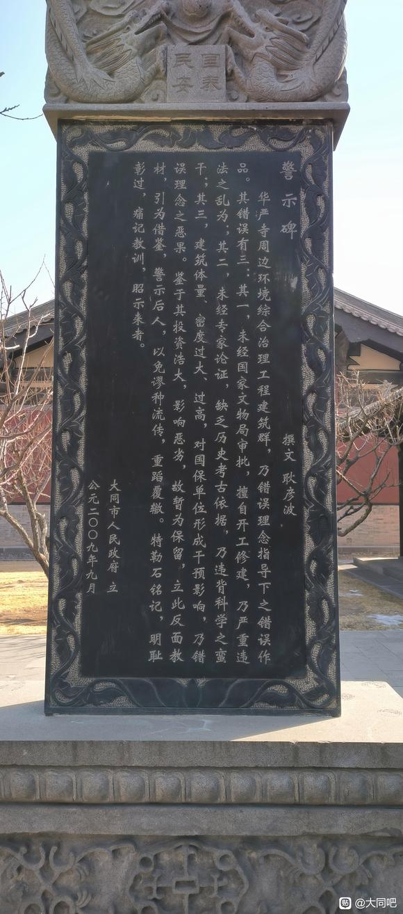 碑文主要內(nèi)容為:華嚴寺周邊環(huán)境綜合治理工程建筑群,乃錯誤理念指導(dǎo)下之錯誤作品。其錯誤有三:其一,未經(jīng)國家文物局審批,擅自開工修建,乃嚴重違法之亂為;其二,未經(jīng)專家論證,缺乏歷史考古依據(jù),乃違背科學(xué)之蠻干;其三,建筑體量、密度過大、過高,對國保單位形成干預(yù)影響,乃錯誤理念之惡果。鑒于其投資浩大,影響惡劣,故暫為保留,立此反面教材,引為借鑒,警示后人,以免謬種流傳,重蹈覆轍。特勒石銘記,明恥彰過,痛記敬訓(xùn),昭示來者。