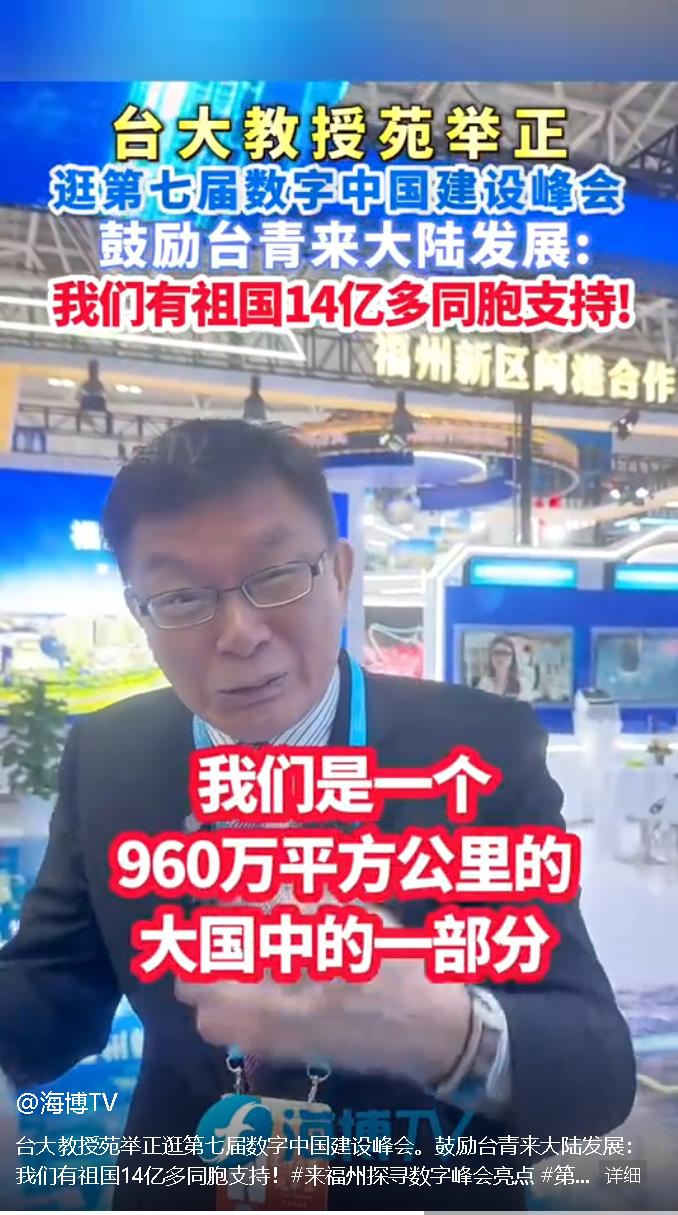 臺大教授苑舉正逛第七屆數字中國建設峰會。鼓勵臺青來大陸發展:我們有祖國14億多同胞支持!