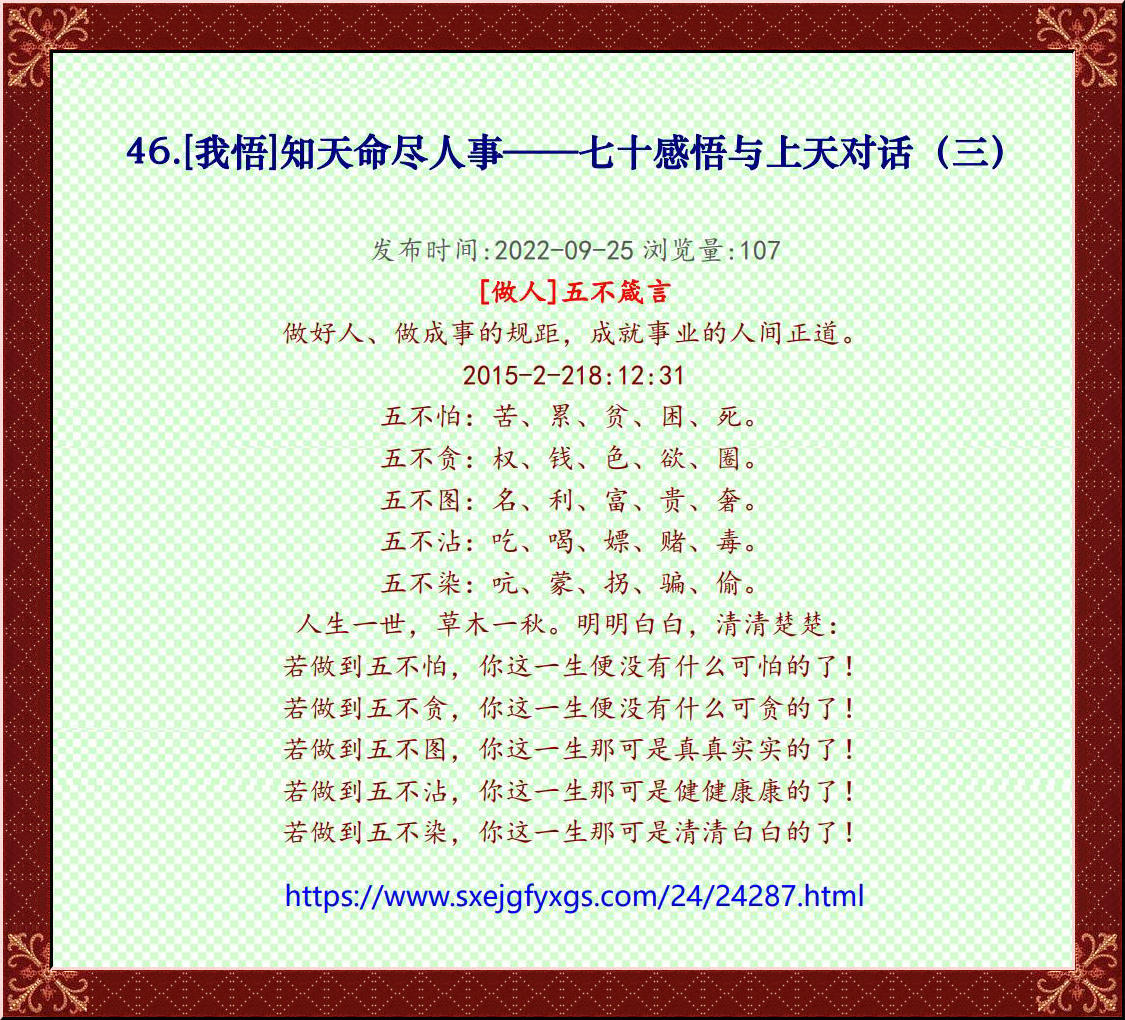 受益于中華優(yōu)秀傳統(tǒng)文化的熏陶與鍛煉,一生一世把孝敬父母作為做人的第一準則和信條,成為我為人處世的哲學思想而守之信之行之——百善孝為先天下大善大德大智慧!
