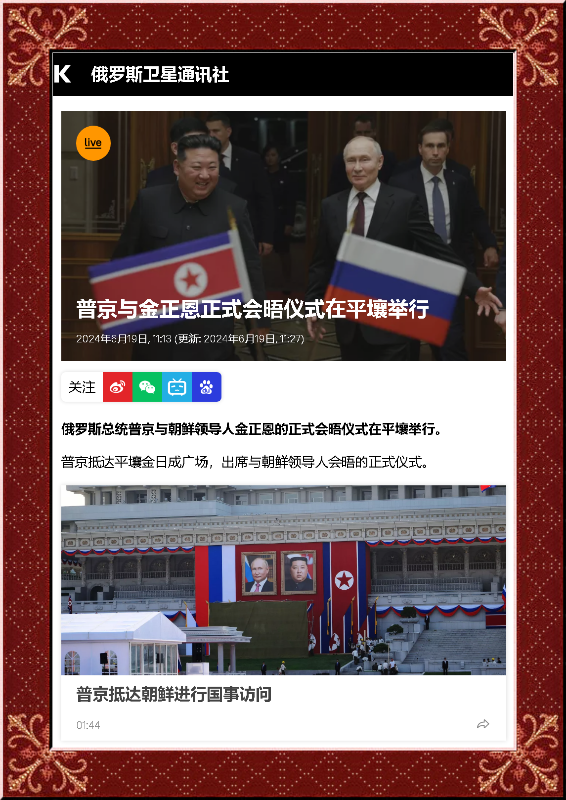 莫斯科時間6月18日,俄羅斯克里姆林宮官網發布了普京在對朝鮮進行國事訪問(18日-19日)前,發表在朝鮮勞動黨機關報《勞動新聞》上的署名文章,普京在文中表達了他對俄朝兩國的伙伴關系前景,以及其在當代世界的重要性的看法,文章標題為《俄羅斯和朝鮮:跨越年代的友誼和合作傳統》。