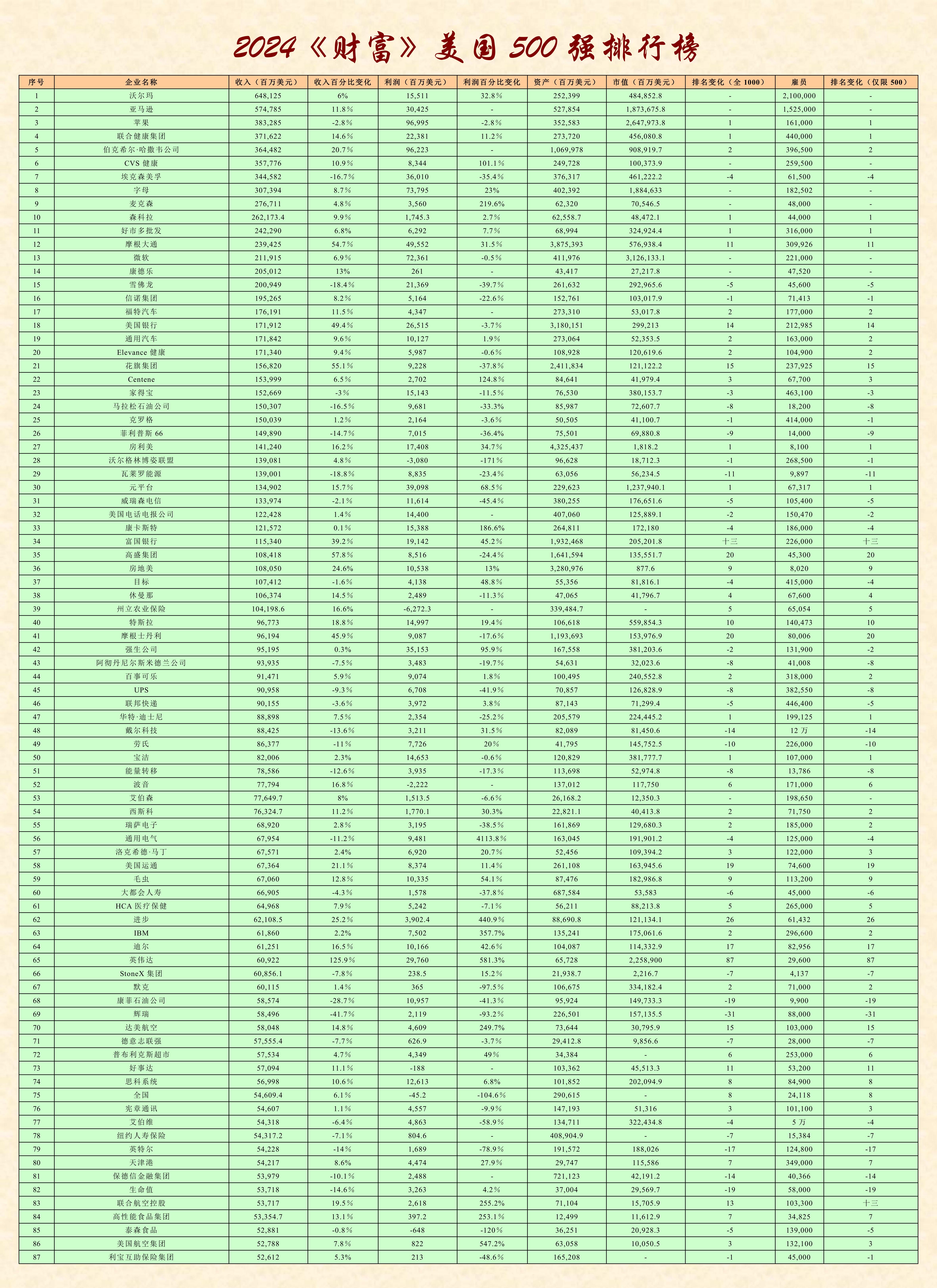 序號 企業名稱 收入(百萬美元) 收入百分比變化 利潤(百萬美元) 利潤百分比變化 資產(百萬美元) 市值(百萬美元) 排名變化(全1000) 雇員 排名變化(僅限500)