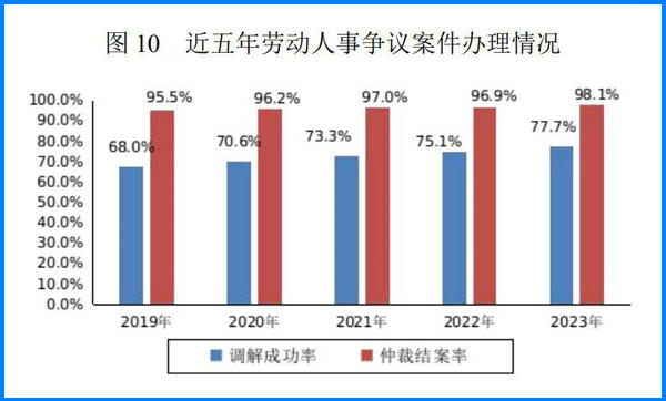 全年全國各級勞動人事爭議調解組織和仲裁機構共辦理勞動人事爭議案件 385.0 萬件,涉及勞動者 408.2 萬人。全年辦結爭議案件 373.4 萬件,結案金額 829.9 億元。全年勞動人事爭議調解成功率 77.7%,仲裁結案率 98.1%,仲裁終結率72.3%。