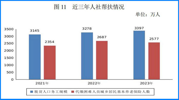 2023 年脫貧人口務工規(guī)模達到 3397 萬人。全國組織農(nóng)民工參加補貼性職業(yè)技能培訓 643 萬人次。國家鄉(xiāng)村振興重點幫扶地區(qū)職業(yè)技能提升工程完成時序目標任務。全年共為 2577萬困難人員代繳城鄉(xiāng)居民基本養(yǎng)老保險費,困難人員參保率保持在 99%以上。選派 2.1 萬名高校畢業(yè)生到基層從事支農(nóng)和幫扶鄉(xiāng)村振興服務。