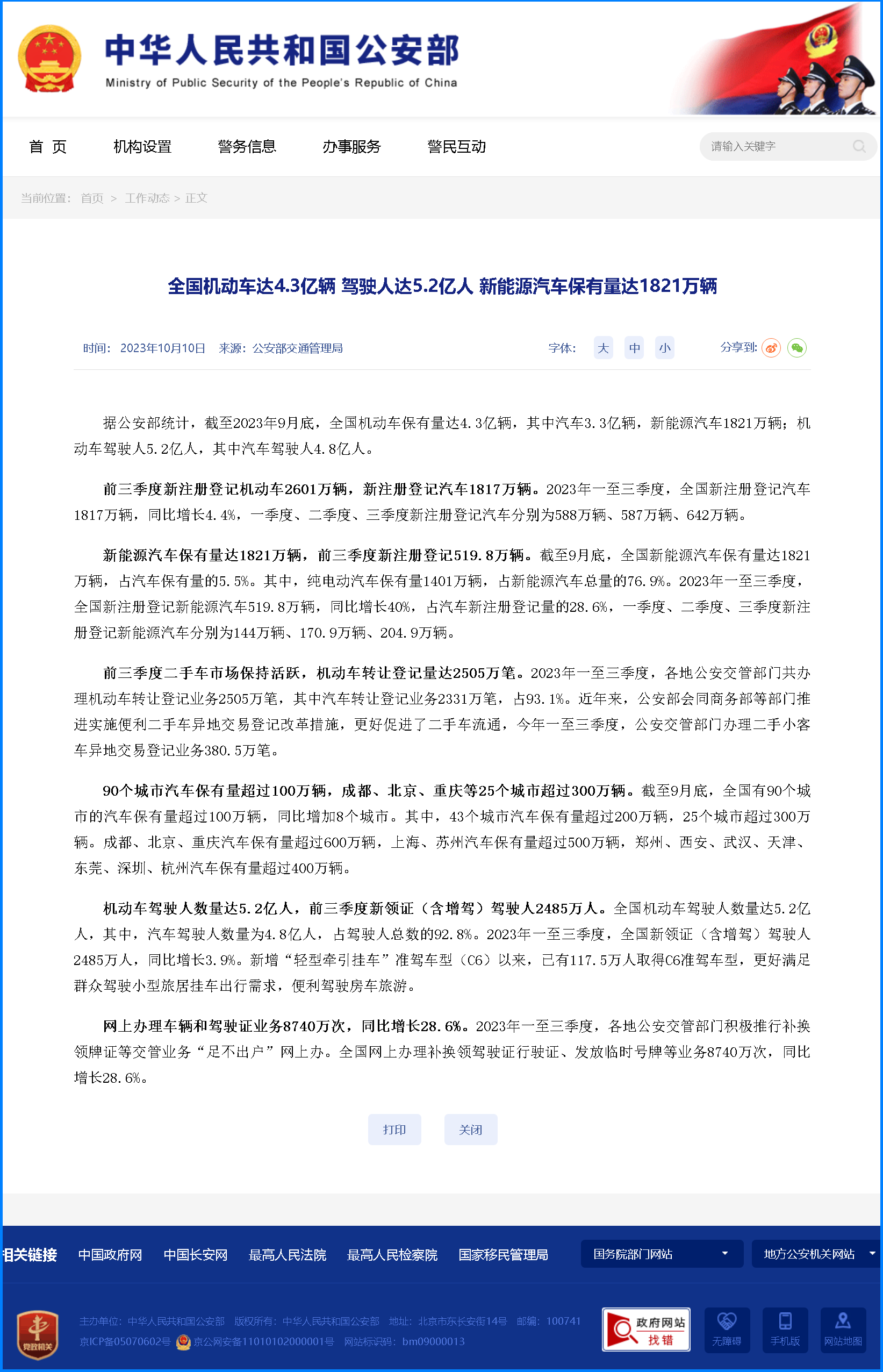 全國機(jī)動車達(dá)4.3億輛 駕駛?cè)诉_(dá)5.2億人 新能源汽車保有量達(dá)1821萬輛